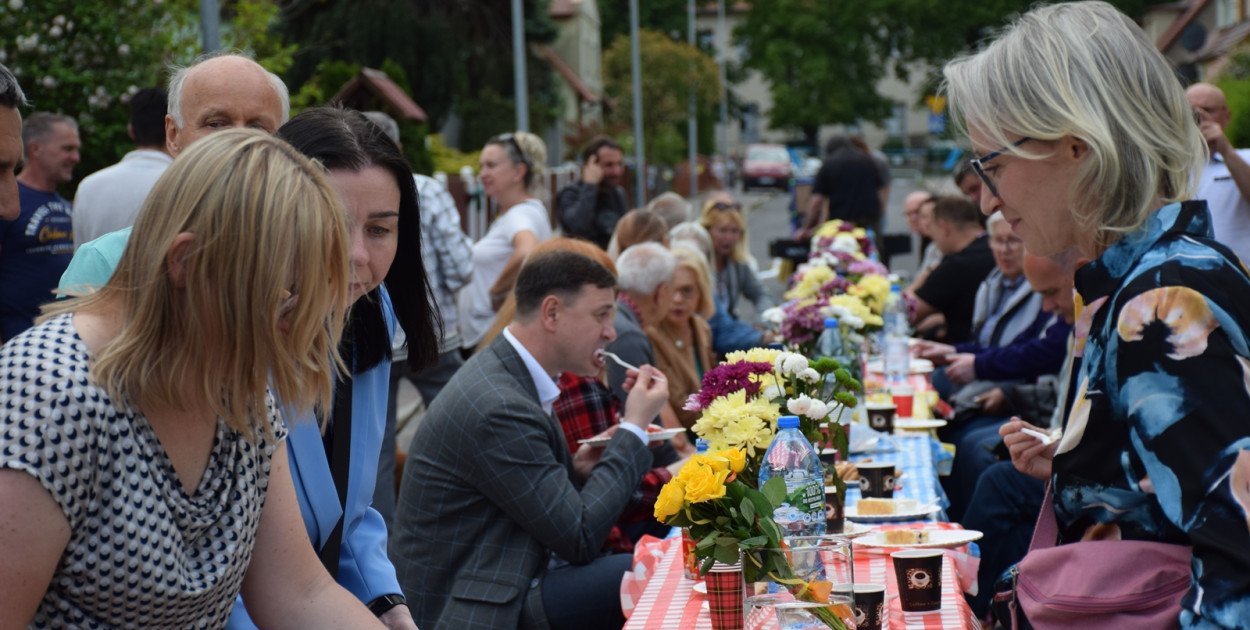 Ulica 10 Maja – 10 maja między godz. 16 a 18 była zamknięta dla ruchu. Na środku rozstawiono stoły, przy których odbywała się imieninowa biesiada, przy napojach, słodkościach i muzyce. Był oczywiście tort upieczony specjalnie na tę okazję. Przyjechał prezydent Głogowa Rafael Rokaszewicz, przyjechali lub przyszli goście – radni, sąsiedzi z okolicy, a każdy kto akurat przechodził, to się przysiadał, częstował albo przynajmniej przyglądał.