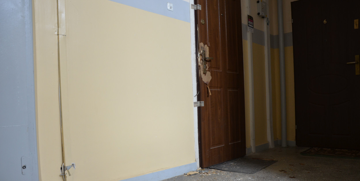 W wieżowcu, na pierwszym piętrze, drzwi do jednego z mieszkań z rozbitym zamkiem są oklejone taśmą policyjną. Podłoga zasypana częściami drewna i tynku. Wyważanie drzwi musieli słyszeć sąsiedzi.