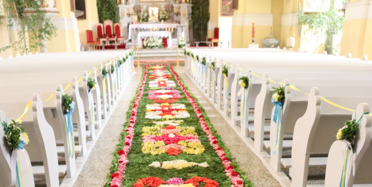 Misternie ułożony dywan kwiatowy już czeka na wiernych w kościele Bożego Ciała w Parafii Św. Mikołaja w Głogowie.