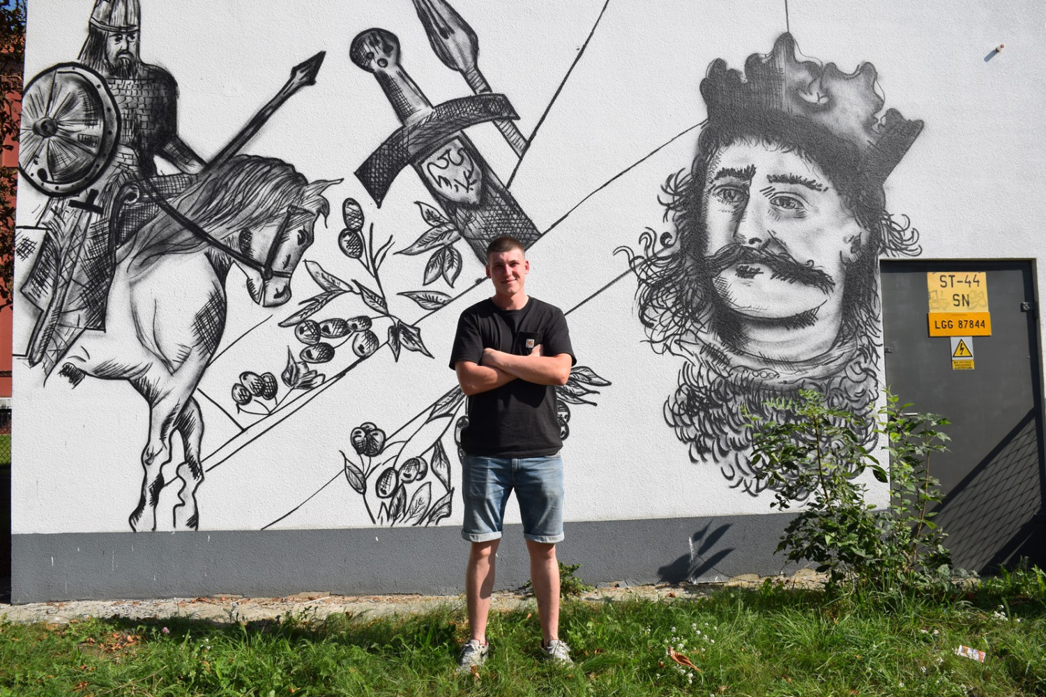 Jak mówi, jest to mural w stylu szkicowym o tematyce historyczno-patriotycznej. Przedstawia Bolesława Chrobrego oraz woja na koniu.