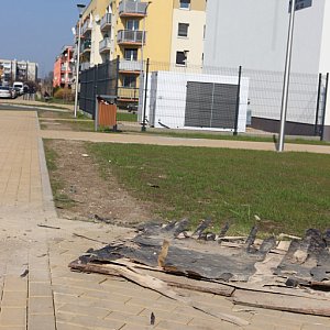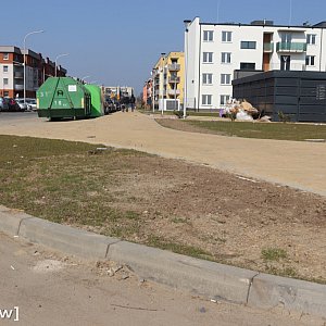Po osiedlu fruwają kartony po przeprowadzce, folia bąbelkowa, a nawet fragmenty drewnianych palet. Trawniki w wielu miejscach są rozjeżdżone nie przez jednego busa, lecz przez znacznie większą liczbę samochodów. Niestety, widać też wydeptane nowe ścieżki, mimo że na osiedlu nie brakuje chodników.