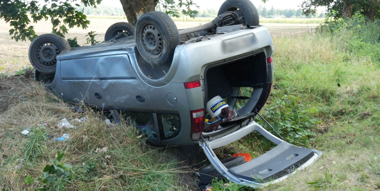 Auto po wypadku miało poważnie uszkodzony dach – część konstrukcji została zmiażdżona. W zdarzeniu ucierpiały dwie osoby: kobieta i dziecko.