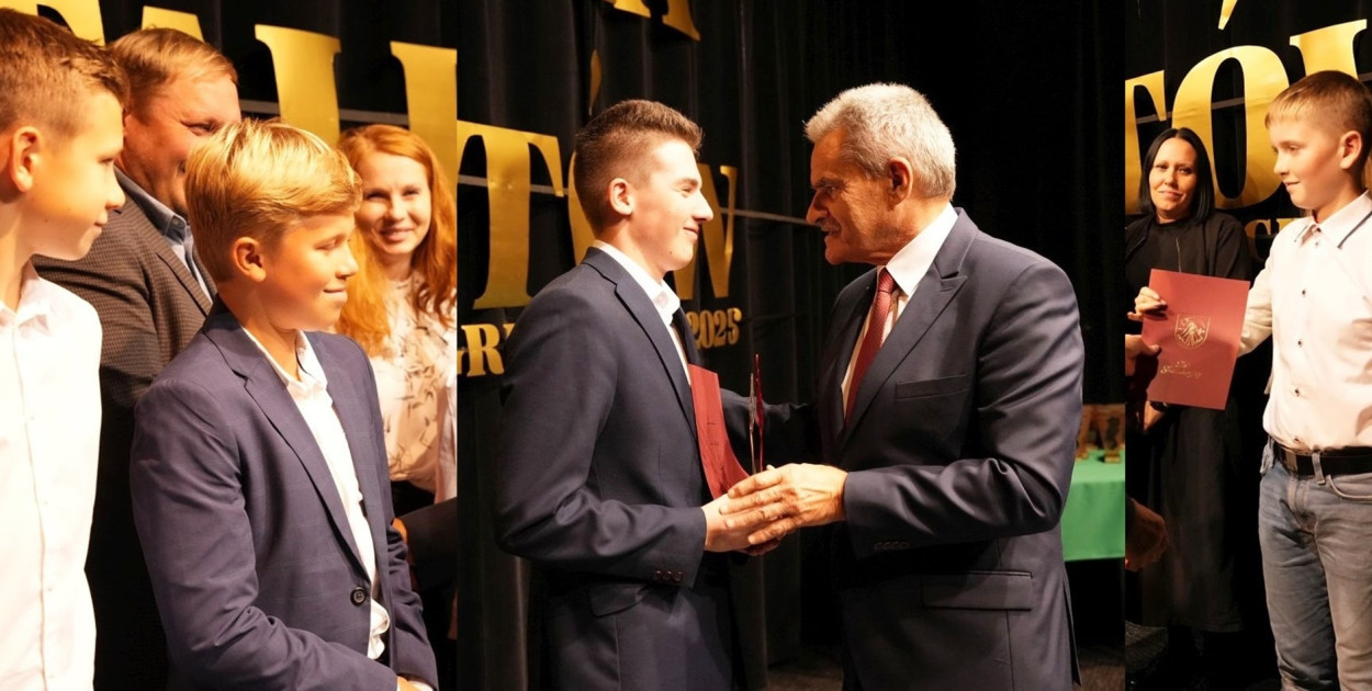 Wójt Roman Jabłoński miał tego dnia sporo pracy na scenie – przez ponad godzinę wręczano dyplomy, statuetki i stypendia. Nie zabrakło serdecznych uścisków dłoni, wspólnych zdjęć oraz wielu słów uznania kierowanych do uczniów, ich rodziców i nauczycieli.