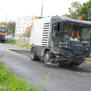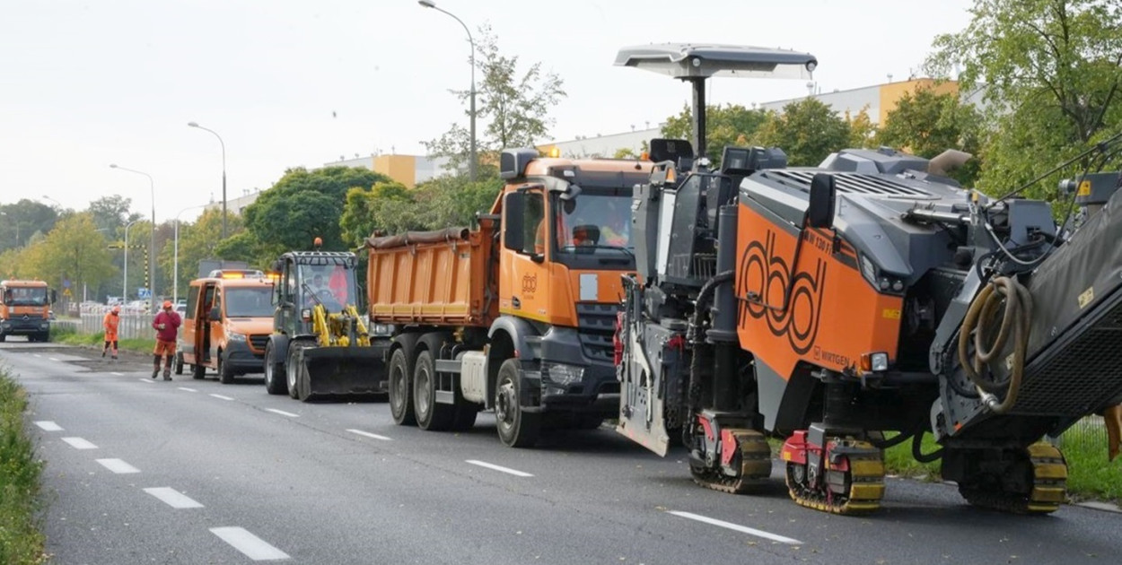 Prace prowadzone są w sobotę ze względu na mniejszy ruch. Intensywne naprawy trwają na jezdni od strony marketu Netto i dalej – w kierunku zjazdu z ronda w ulicę Kazimierza Sprawiedliwego.