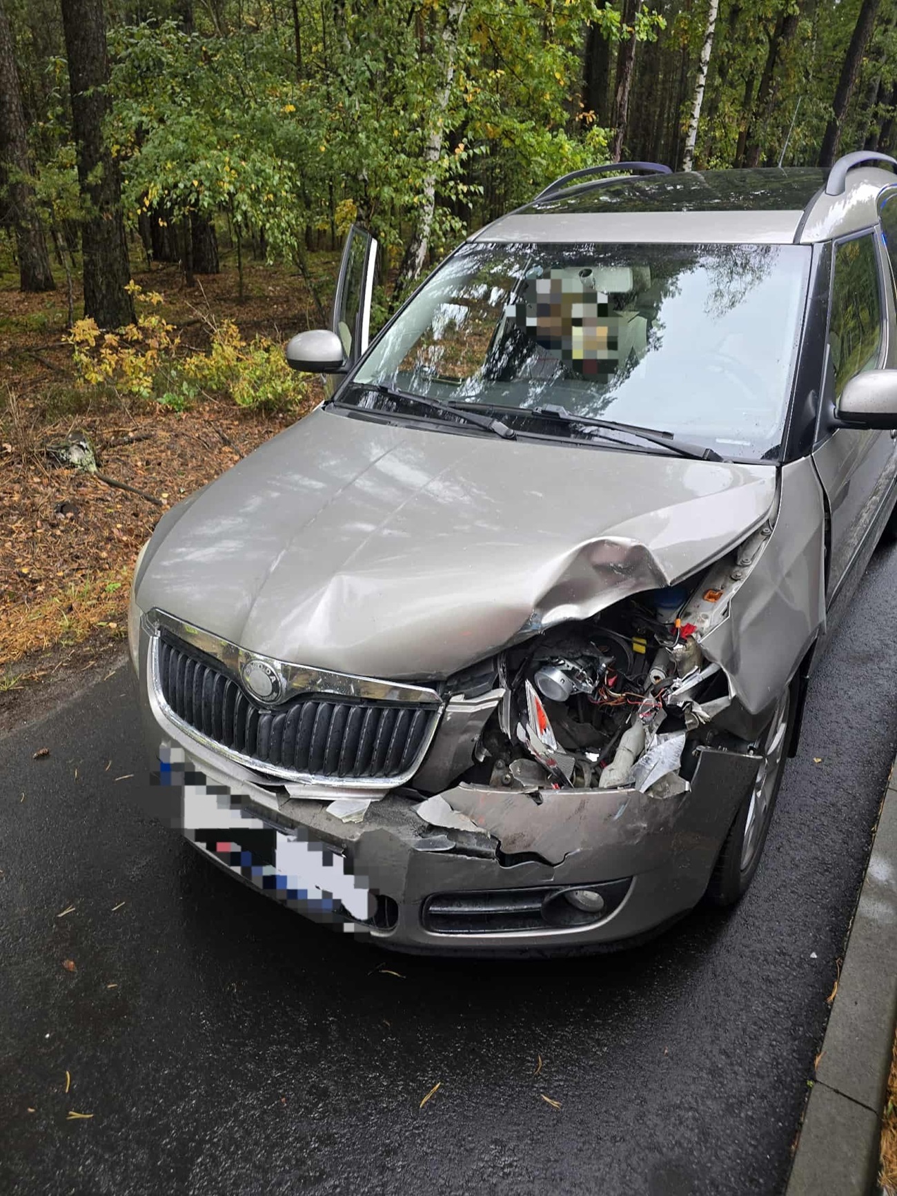 W wyniku zderzenia doszło do strat materialnych – uszkodzone zostały karoserie pojazdów, wgniecione elementy nadwozia oraz rozbite reflektory.