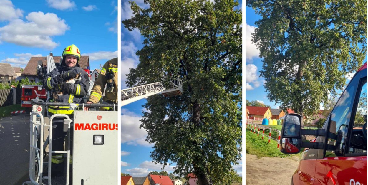 Strażacy z OSP Wietszyce oraz z PSP Głogów nieśli ratunek kotkowi, który wszedł bardzo wysoko na drzewo i bał się zejść. Z Głogowa była ściągana długa drabina.