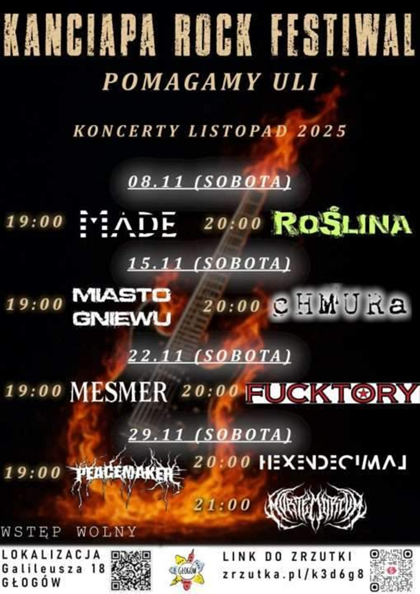 W każdą sobotę listopada w Centrum Kopernik przy ulicy Galileusza 18 odbywać się będą koncerty w ramach Kanciapa Rock Festiwalu – cyklu, który ma nie tylko dostarczyć muzycznych emocji, ale też wesprzeć zbiórkę na leczenie Uli Brach-Dyk, żony jednego z głogowskich muzyków.