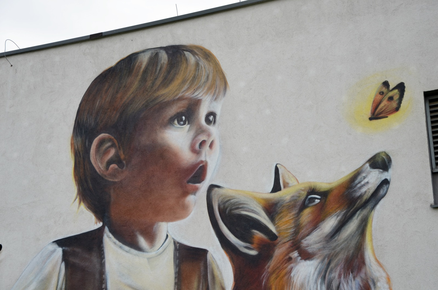 - dodaje artystka. Pracę zaczyna od projektu i rysunku. Ściana pływalni jest długa z wieloma oknami. Z jednej strony już namalowała chłopca trzymającego otwartą książką z legendami, z której wychodzą zwierzęta.