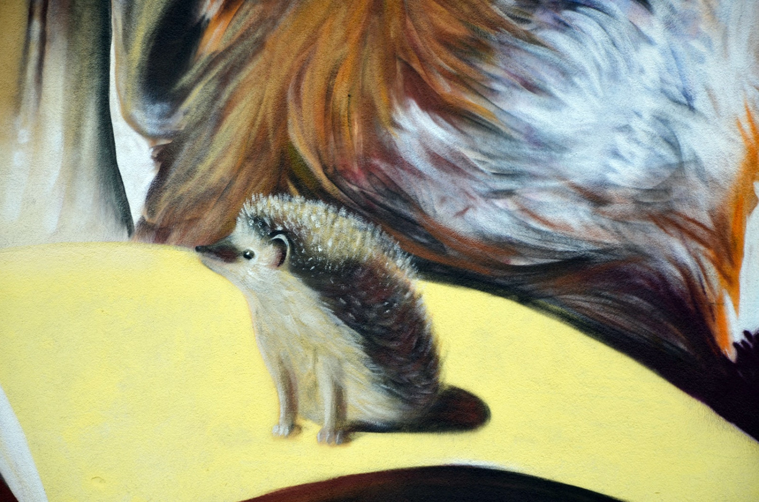 Ta książka się świeci, żeby już było trochę magicznie i ciekawie. Od tego będzie uciekała wiewiórka i mam nadzieję tak prowadzę wasze oko na drugą stronę ściany. Będzie więcej roślin pomiędzy, co będzie łączyło obie części ściany. Tam będzie się otwierała nowa scena z legendą, będzie więcej detali i koloru, bo to będzie główna strona tego murala