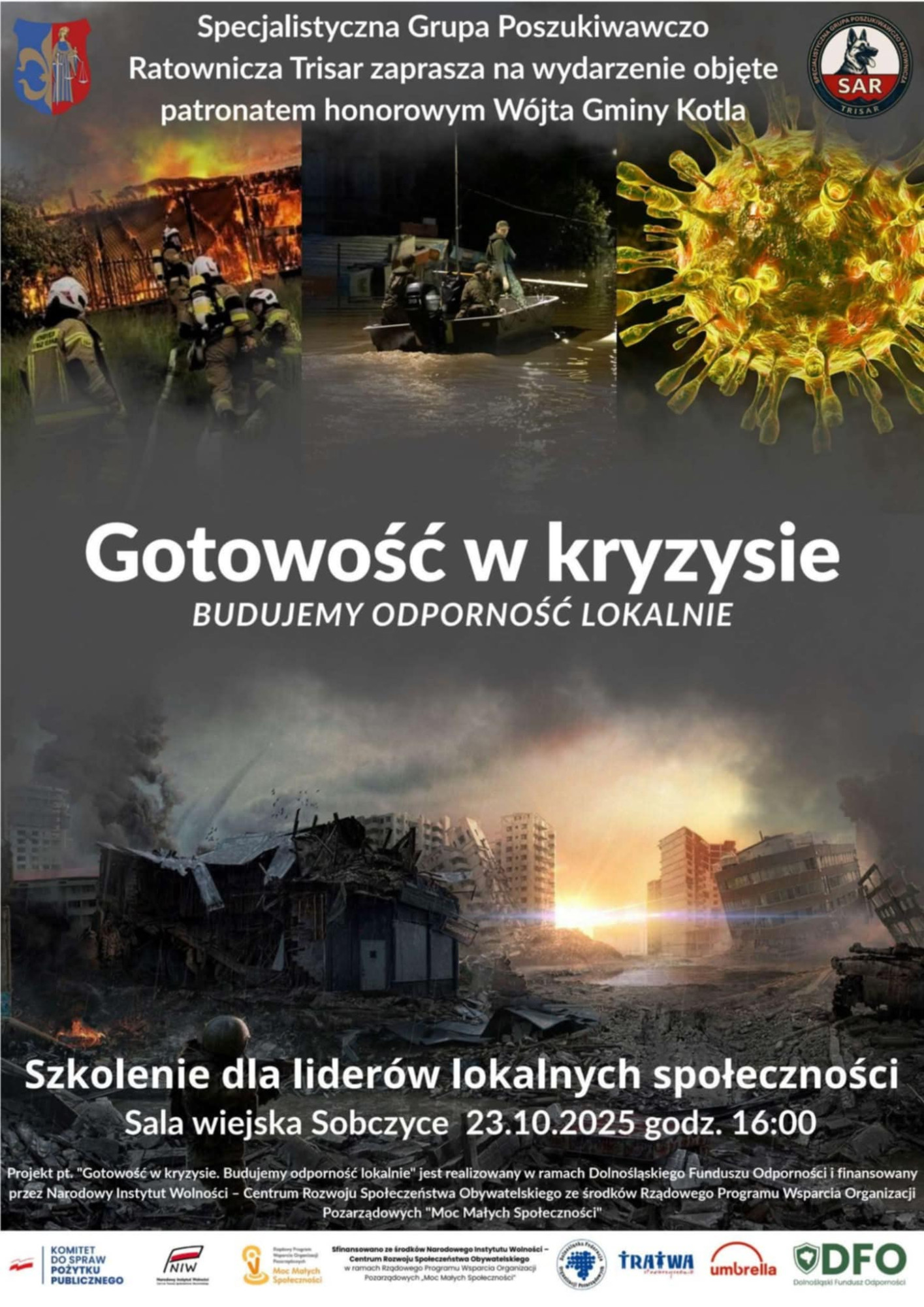 Organizatorem szkolenia z zakresu przygotowania się na sytuacje kryzysowe jest stowarzyszenie Trisar (Specjalistyczna Grupa Poszukiwawczo Ratownicza z Głogowa), które pozyskało fundusze na ten cel z Dolnośląskiego Funduszu Odporności - projekt Gotowość w kryzysie. Budujemy odporności lokalne. Honorowy patronat objęła wójt gminy Kotla Kamila Suchocka-Szperlik. Szkolenie odbędzie się w czwartek (23.10) o godz. 16 w sali wiejskiej w Sobczycach. W przyszłości być może uda się pozyskać fundusze na takie szkolenia w innych podgłogowskich gminach.