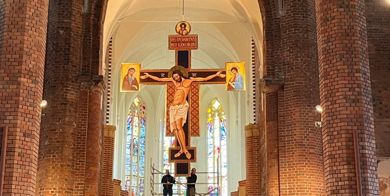 Udało się! W głogowskiej kolegiacie zawisł dziś monumentalny, siedmiometrowy krzyż autorstwa Mirosława Grzelaka. To wyjątkowe dzieło, łączące wizerunki Chrystusa Ukrzyżowanego i Zmartwychwstałego, stało się nowym, centralnym punktem świątyni.