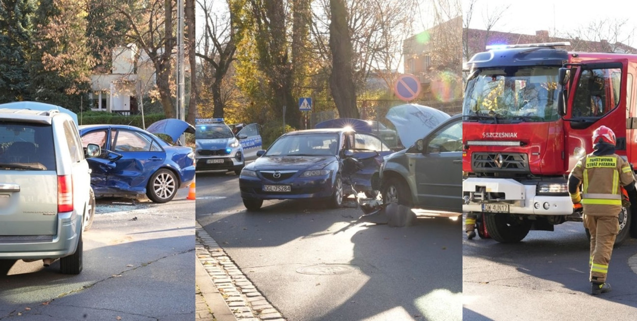Poważne zderzenie dwóch pojazdów na problematycznym skrzyżowaniu. Na miejscu policja, strażacy i ratownicy medyczni.