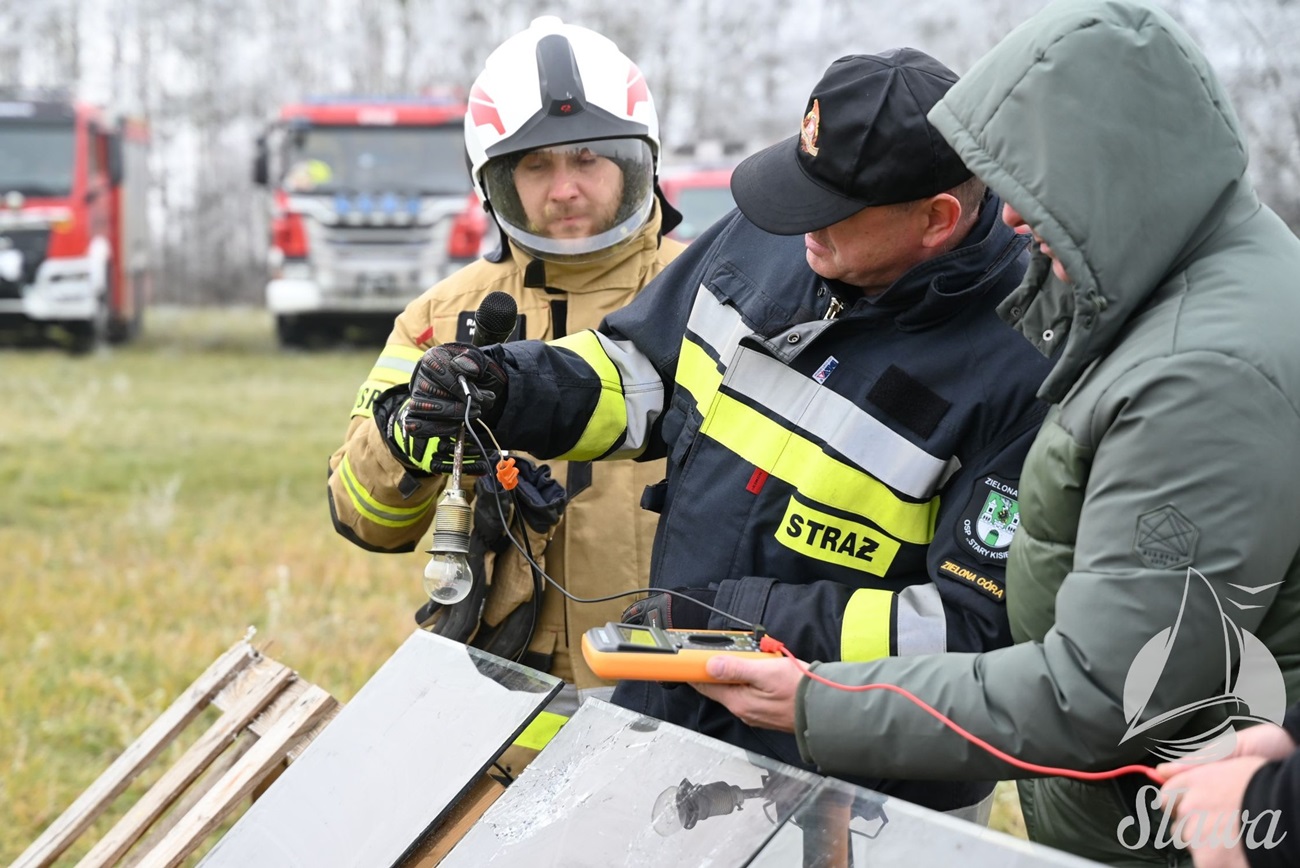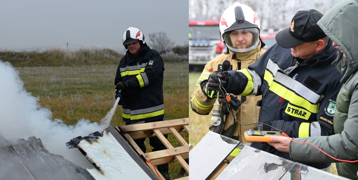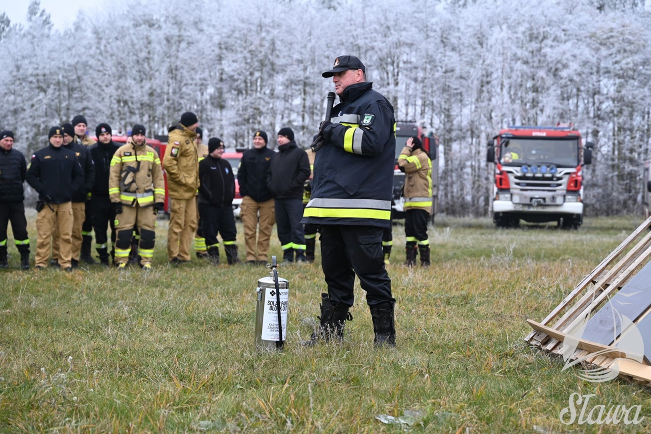 Szkolenie praktyczne odbyło się w terenie i obejmowało m.in. symulację pożaru paneli fotowoltaicznych oraz działania gaśnicze w warunkach zbliżonych do rzeczywistych.