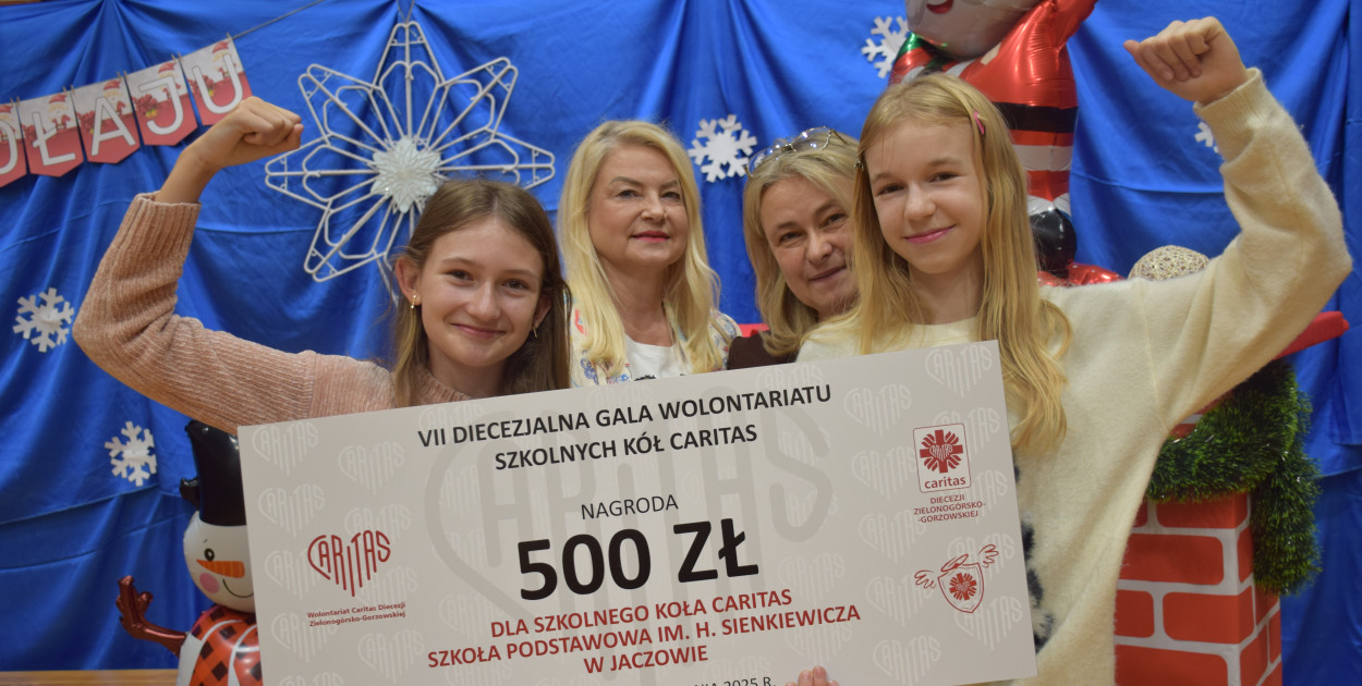 Gala odbyła się 3 grudnia w Zielonej Górze i była okazją, by podziękować tym, którzy na co dzień niosą wsparcie potrzebującym, organizują zbiórki, pomagają seniorom i dzieciom, angażują się w życie parafii i lokalnej społeczności. Wśród 23 wyróżnionych wolontariuszy były właśnie dziewczyny z SP w Jaczowie 13 – latki Agata Brygier i Zuzanna Gruba oraz ich koleżanka z koła Caritas Zuzanna Walkowiak, która jest studentką.