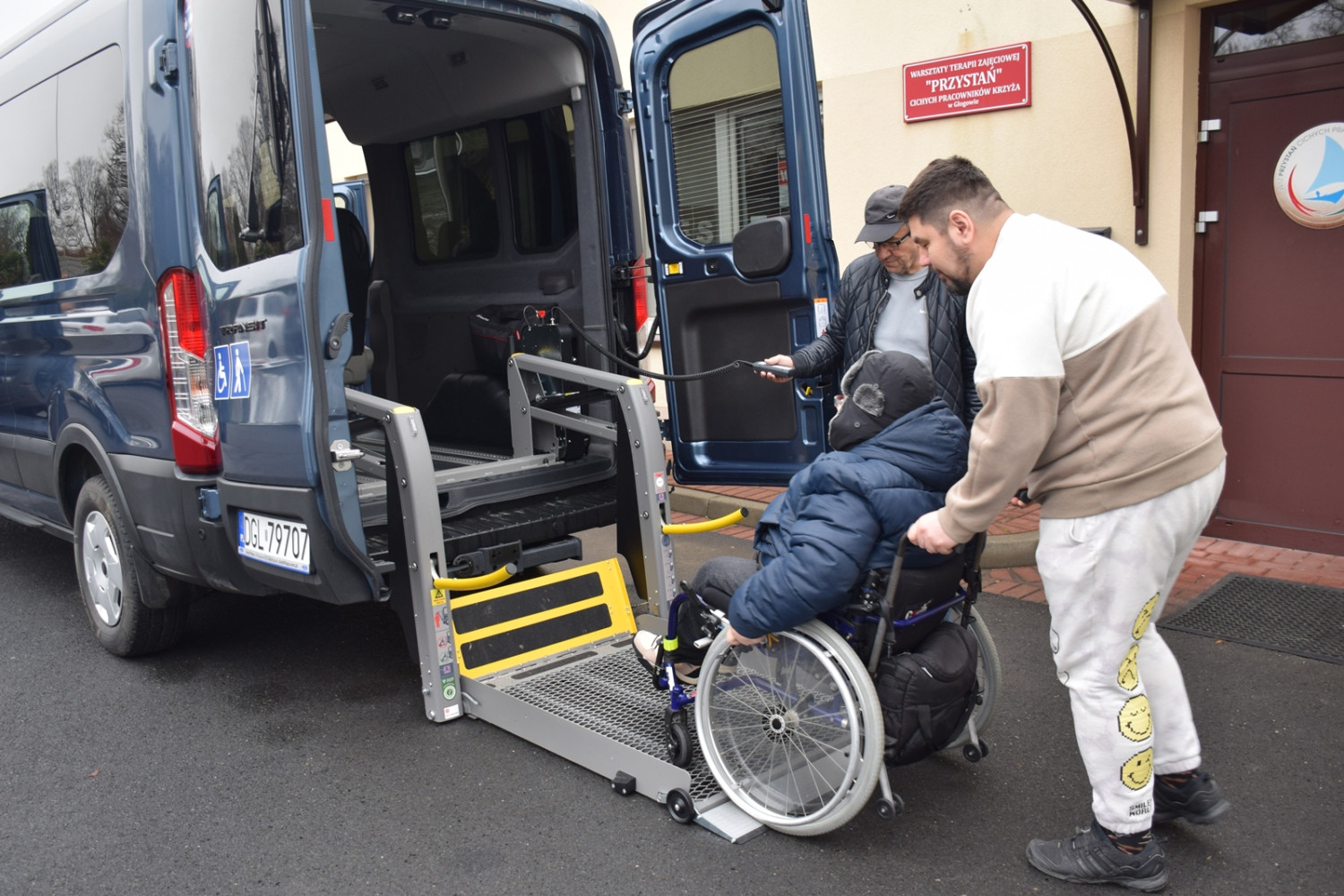 Wielka radość w Warsztatach Terapii Zajęciowej "Przystań", bo Fundacja KGHM ufundowała busa z windą przydatną dla niepełnosprawnych na wózkach. Taki bus z Głogowa po wioskach robi ok. 190 kilometrów dziennie, przywożąc dorosłych niepełnosprawnych.