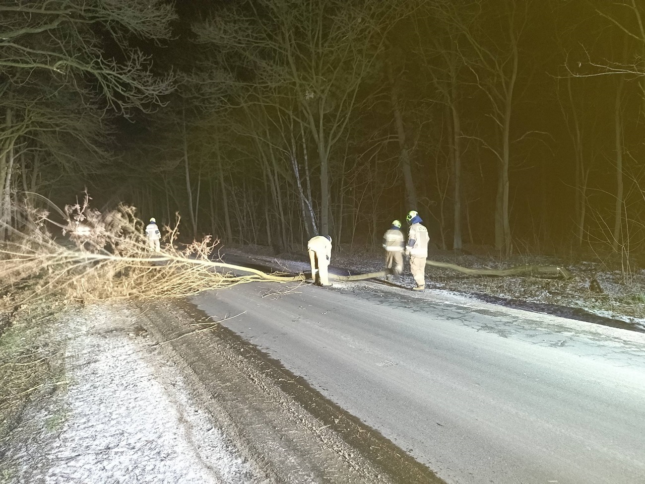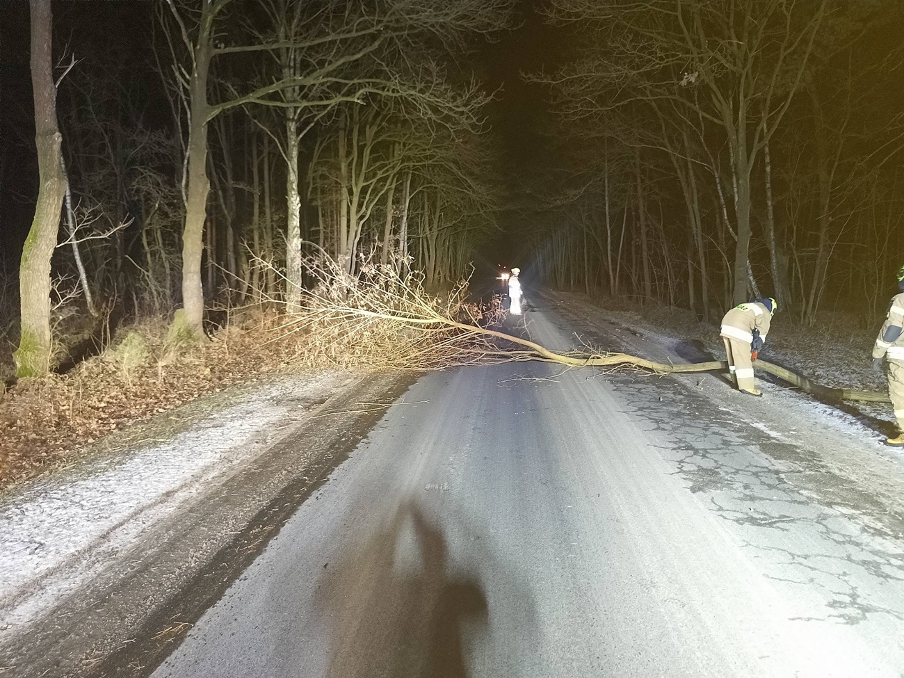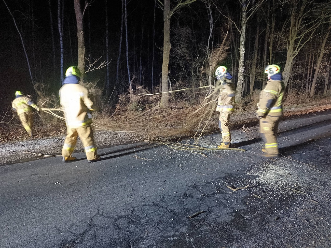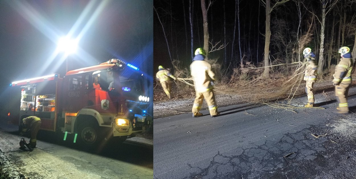 Jak relacjonują strażacy, po dojechaniu na miejsce okazało się, że drzewo dosłownie wisiało nad pasem jezdni. Strażacy musieli interweniować radykalnie – ścięli najbardziej zagrażającą część drzewa.