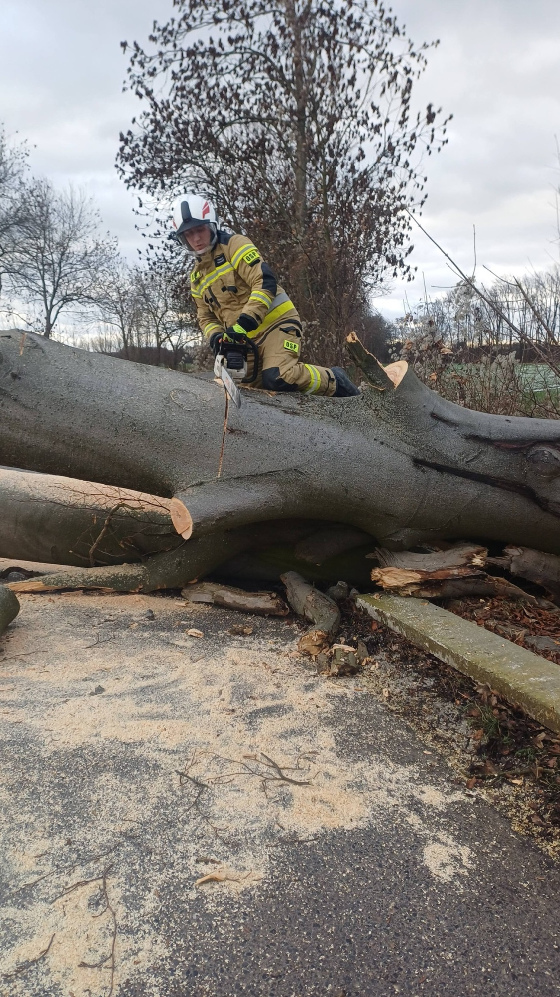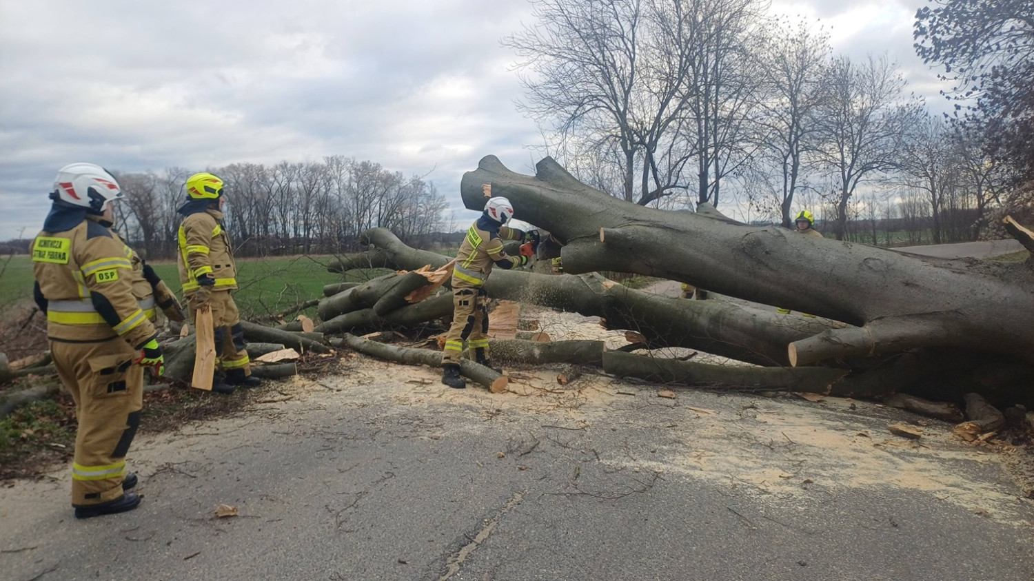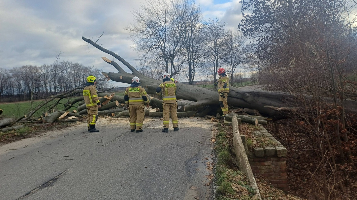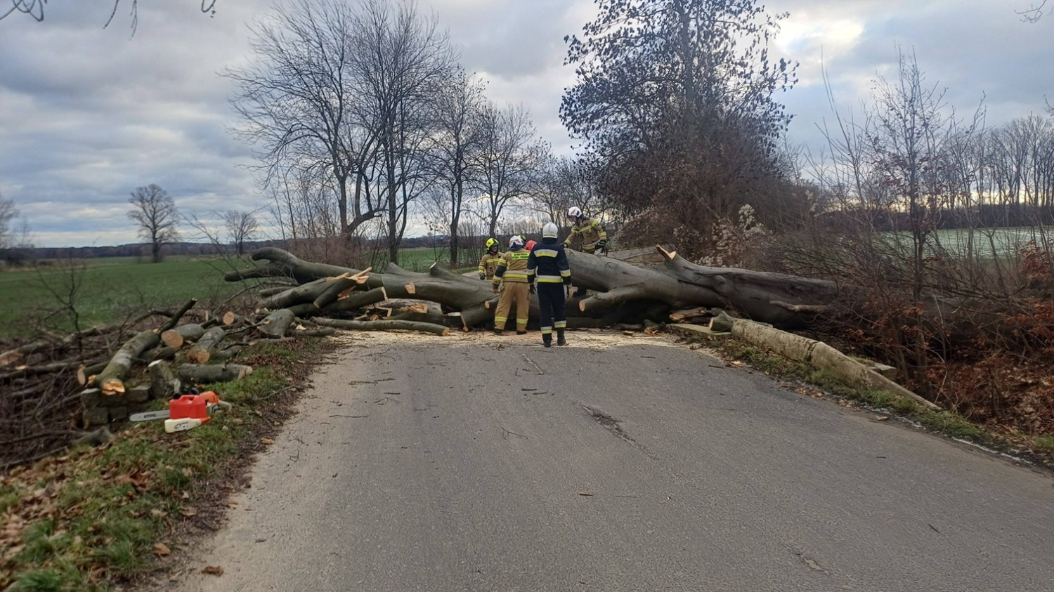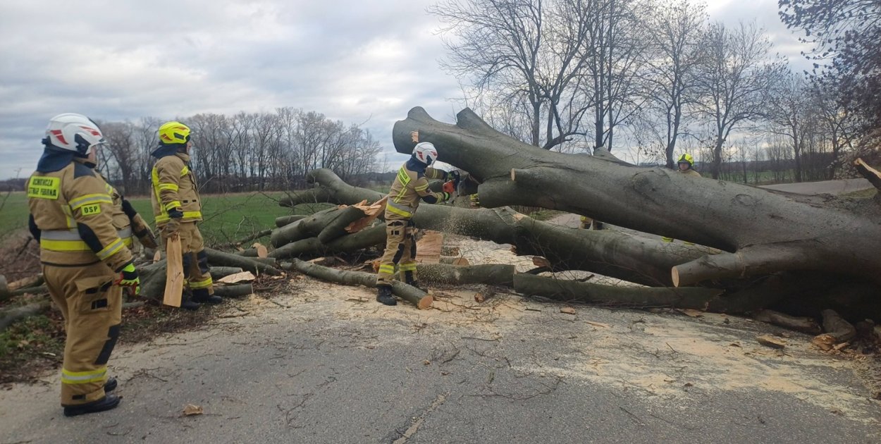 Zgłoszenie o zablokowaniu jezdni dotarło na numer alarmowy około godz. 12:06. Powalone drzewo spadło na jezdnię, ale na całe szczęście droga była pusta i nie został uszkodzony żaden samochód.
