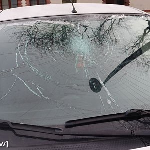 Całkowicie rozbita przednia szyba w samochodzie. Straty materialne i brak możliwości odwiezienia dzieci do szkoły - taki jest efekt kolejnej demolki na głogowskim osiedlu.