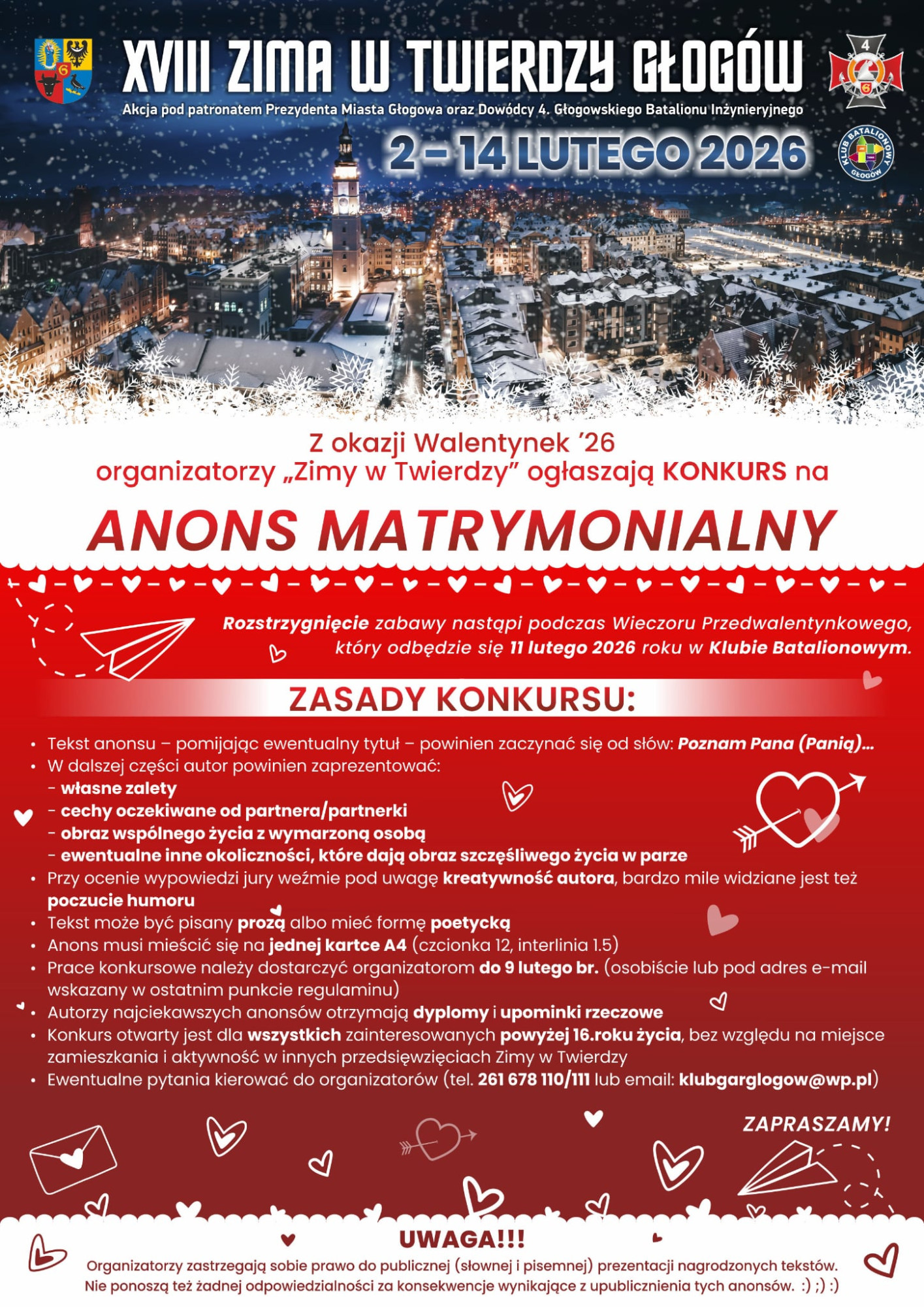 Z okazji święta zakochanych można wziąć udział w konkursie na anons matrymonialny. Przewidziane nagrody.