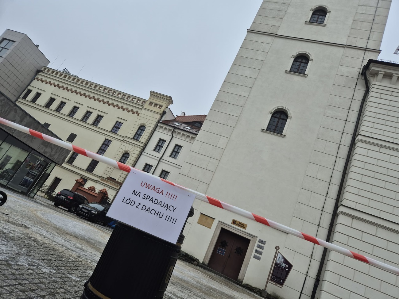 Wokół ratusza wyznaczono taśmą strefę ochronną. I tu niestety pojawia się problem - część mieszkańców robi sobie skróty i przechodzi pod taśmą. To nierozsądne i niebezpieczne.