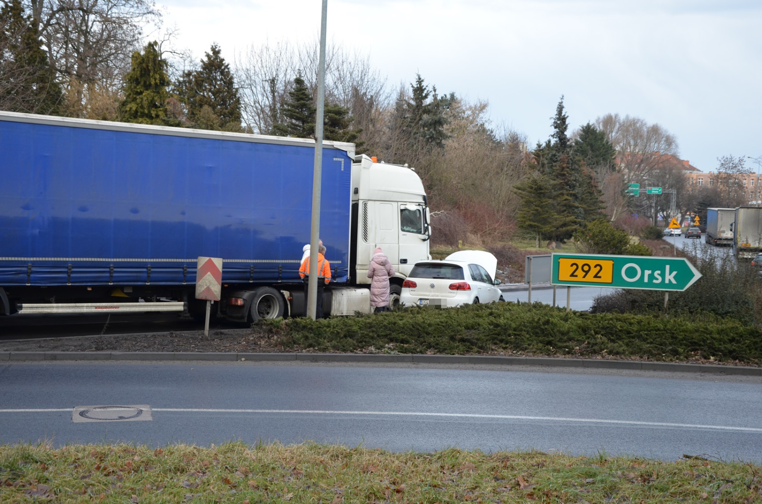 Do kolizji Volkswagena z ciężarówką doszło w środę (11.02.) po godz. 11, na wysokości wysepki z rozjazdem w kierunku Wałów Chrobrego.
