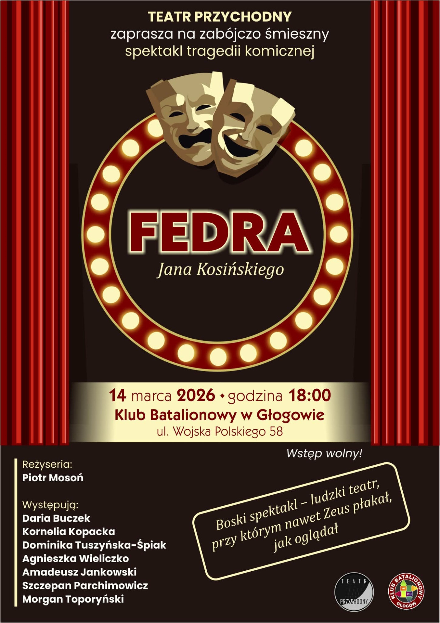 Zauważony został także spektakl pt. Fedra w wykonaniu grupy Teatru Przychodnego. Występuje w nim siedem osób. Teatr ten od ubiegłego roku działa pod skrzydłami Klubu Batalionowego, prowadzi go instruktor Piotr Mosoń. Spektakl Fedra zobaczymy w Głogowie na scenie w Klubie Batalionowym już niebawem.
