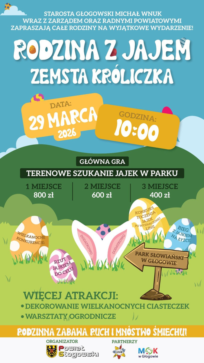 W niedzielę (29.03.) Starostwo Powiatowe w Głogowie organizuje, po raz drugi, zabawę „Rodzina z jajem”. Tym razem z dopiskiem – zemsta króliczka. To gra terenowa dla całych rodzin z terenu powiatu głogowskiego, która odbędzie się w Parku Słowiańskim. Początek o godz. 10. Nie zabraknie atrakcji, ale i nagród. O tym wszystkim na plakacie poniżej oraz w naszym materiale wideo.