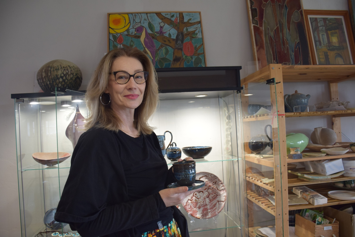 Jako artystka przechodziła różne etapy twórczości. W gablocie można zobaczyć jej przykładowe prace, bo większość od razu sprzedaje. Przeważnie pracuje na zamówienie. Jej specjalnością są unikatowe ozdobne naczynia ceramiczne. Tworzy je z porcelany lub z kamionki. Jej kubki, talerze i patery żyją swoim życiem kolorów i kształtów.