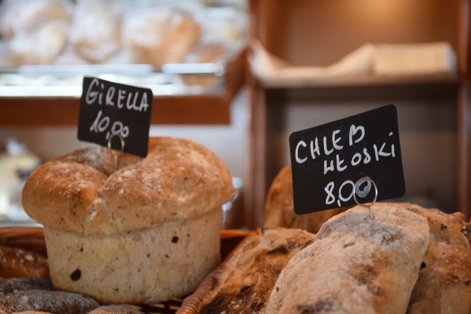 W piekarni, która działa na zapleczu, wypiekane są chleby na zakwasie – ciemne i jasne, aromatyczne, dokładnie takie, jak kiedyś. Do tego świeże bułki, bagietki, rogale i drożdżówki. Przeróżne rodzaje