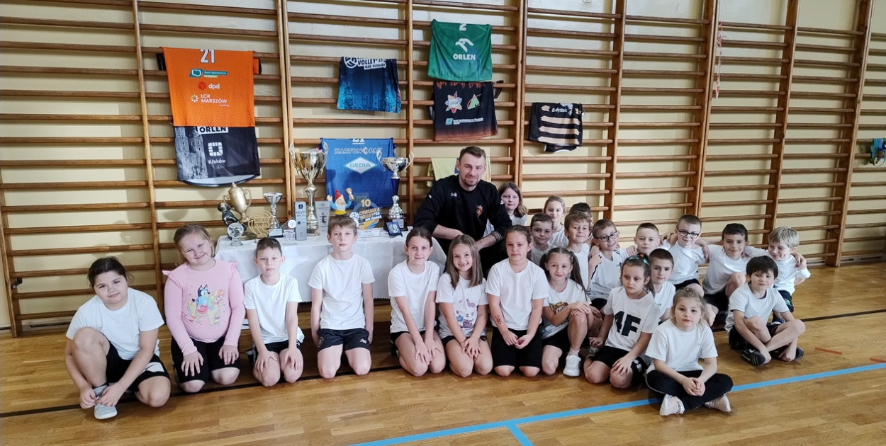 Uczniowie mieli okazję uczestniczyć w lekcjach wuefu prowadzonych przez siatkarza Marcina Brzezińskiego.