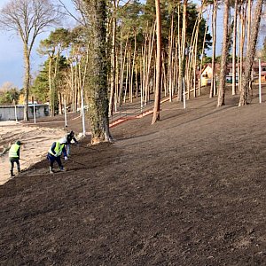 W ubiegłym tygodniu praktycznie zakończono już prace na skarpach, a nawet posiano trawę i praktycznie trwają tylko prace porządkowe. Jak widać nawieziono już i wyrównano znaczną część piasku podkładowego i w tym tygodniu te prace związane z jego uzupełnieniem mają być również zakończone. Dowieziona jeszcze zostanie kilkunastocentymetrowa warstwa piasku płukanego.