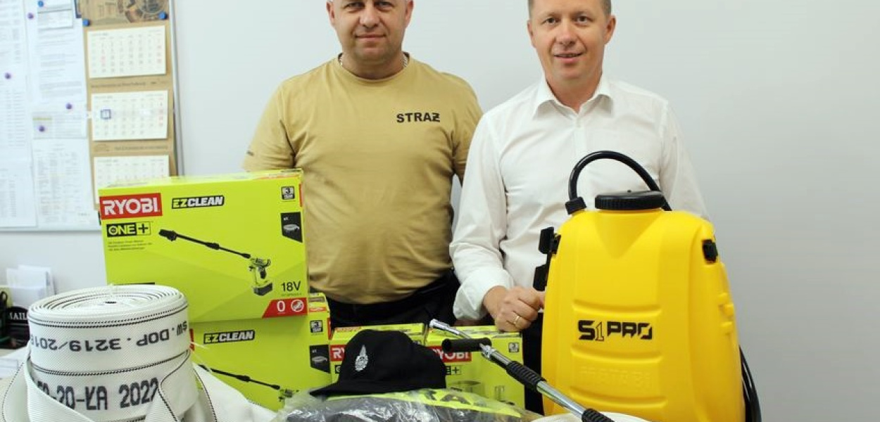 Strażacy ochotnicy dostali na wyposażenie m.in.: myjki akumulatorowe, szlifierki, szelki bezpieczeństwa, hydronetki, węże strażackie, nosze płachtowe, umundurowanie, zestaw ratownictwa wysokościowego, ładowarki, akumulatory, wiertarko - wkrętarkę, piłę szablastą, nożyce do prętów i turbowentylator oddymiający.