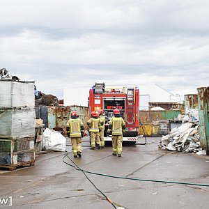 Akcja strażaków na złomowisku odpadów metalowych w samym centrum miasta. Działa tam kilka zastępów PSP oraz wszystkie OSP z miejscowości wokół Głogowa. W wielkiej hałdzie metalowych odpadów coś się pali.