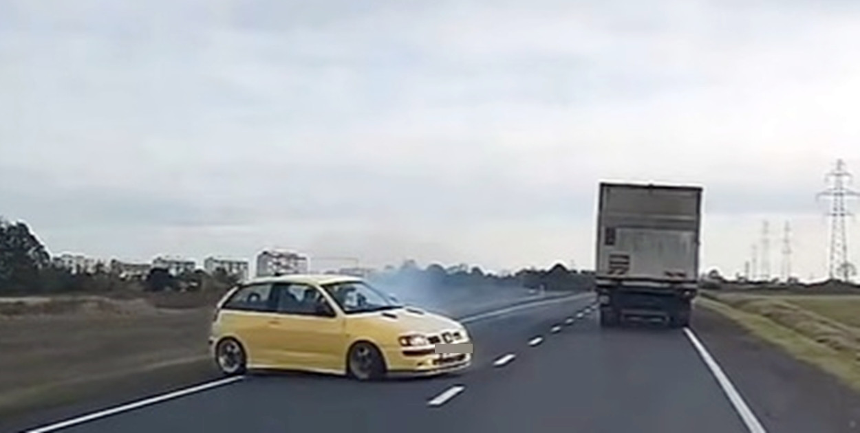 W sieci pojawiło się nagranie, na którym widać, jak kierowca BMW wyprzedza ciężarówkę – na czołówkę. Z naprzeciwka jedzie seat. Jego kierowca w ostatniej chwili zjeżdża na pobocze, wpada w poślizg i cudem unika zderzenia. Po opanowaniu auta rusza w pogoń za uciekającym BMW.