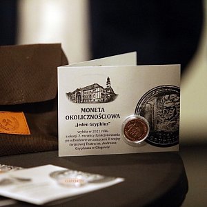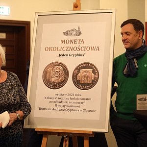 W ubiegłym roku Dariusza Czai i Zdzisława Błażejewskiego wybiło monetę "Jeden Grosz Kolegiacki". Teraz miejscowym regionalistom udało im się zrealizować kolejny pomysł. Powstała moneta "Jeden Gryphius". Wybity przy okazji drugiej rocznicy funkcjonowania Teatru im. Andreasa Gryphiusa. Dziś (3.12.) jej promocja odbyła się w miejskim tetrze. - Na jej awersie znajduje się dzisiejszy widok głogowskiego teatru z uwypuklonym portalem głównym, otoczony napisem: Teatr im. Andreasa Gryphiusa w Głogowie - przytaczał regionalista Dariusz Czaja. Dodawał, że rewers zawiera cyfrę "jeden" połączoną z wizerunkiem patrona budynku - Andreasa Gryphiusa. - Moneta znajduje się w ochronnym kapslu, wpięta w okolicznościową książeczkę, jest cegiełką na głogowską kolegiatę - zaznaczał.