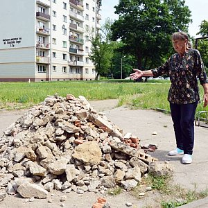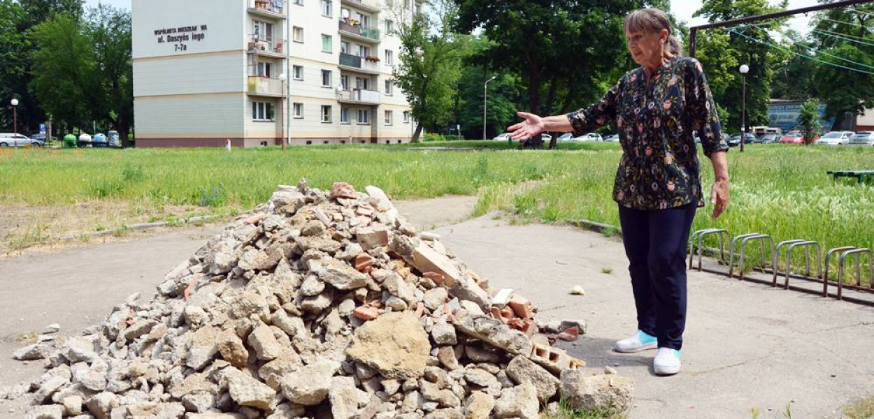 Józefa Adrysiak (74 l.) pokazuje nam, że gruz z tej posadzki składowany jest tuż pod ich klatką. - Za przeproszeniem te gówna wyrzucili nam pod okno. Potem, po naszej interwencji, aby coś z tym zrobili... zasypali je gruzem. Tutaj dzieci biegają, bawią się, gdzie jest kontener? - dopytuje. - Nie dość, że śmierdzi, to jeszcze się kurzy - żali się.