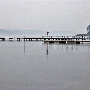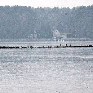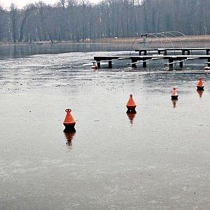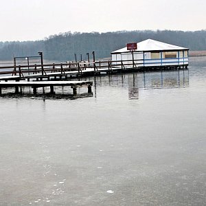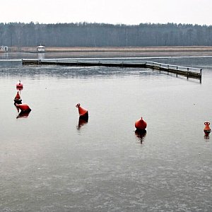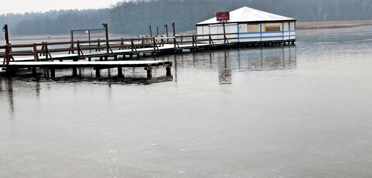 Brak wiatru i niskie temperatury sprawiły, że Jezioro Sławskie pokryło się lodem. Na razie jest to cienka, krucha warstwa. Nie należy wchodzić na zamarznięty akwen.