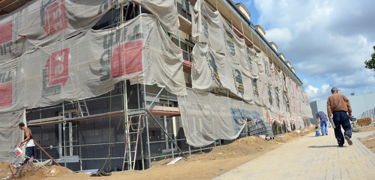 Praca na budowie nowego bloku Towarzystwa Budownictwa Społecznego przy ul. Generała Józefa Sowińskiego w Głogowie wre. Pracownicy tynkują ściany, a w pierwszych dwóch klatach w łazienkach są już nawet kładzione płytki. - Trzeba jeszcze położyć panele i wymalować ściany w mieszkaniach. W międzyczasie jeszcze wykończyć korytarze - mówią.