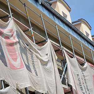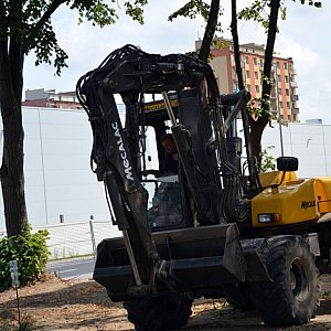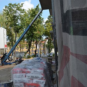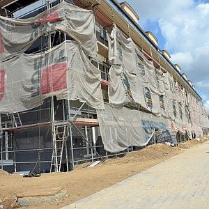 Nikt nie próżnuje także na zewnątrz budynku, gdzie koparka wyrównuje terenu pod plac zabaw. Trwają również prace wykończeniowe elewacji. Obok wejść gotowa jest brukowa kostka.