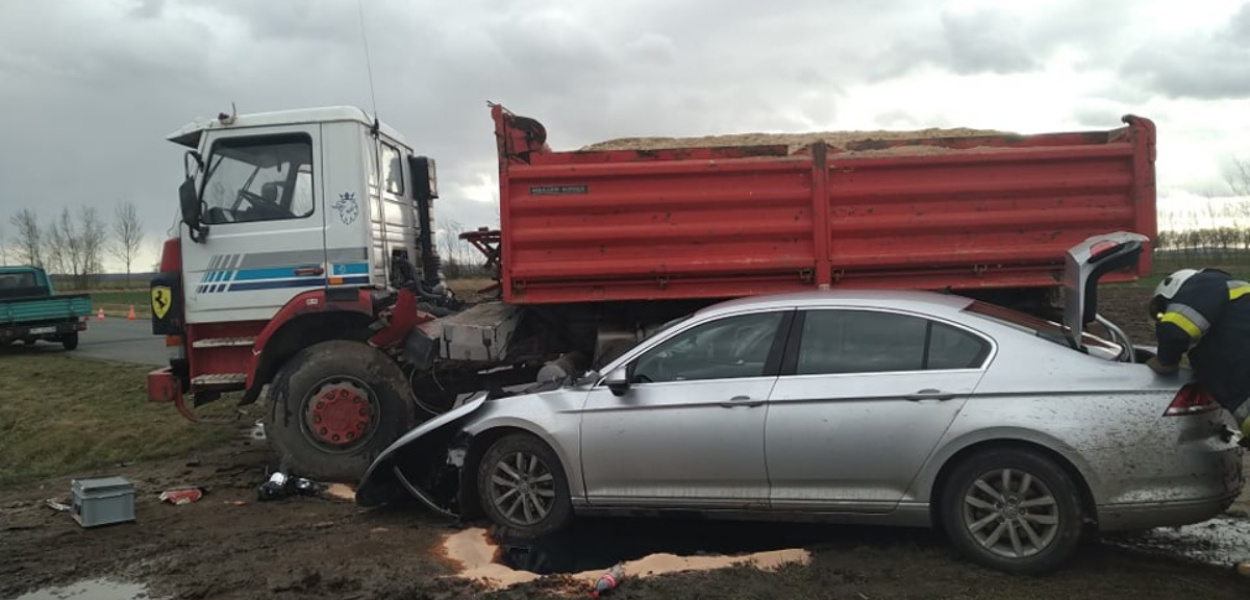Na drodze wojewódzkiej za Przedmościem doszło do poważnego wypadku. Kierowca scanii przyhamował, bo chciał skręcić w lewo, w drogę polną. A jadący za nim dostawczy volkswagen też przyhamował. Jednak trzecie auto w kolejności, czyli osobowy volkswagen zaczął wyprzedzać. Ominął dostawczaka i uderzył z dużą siłą w wywrotkę.