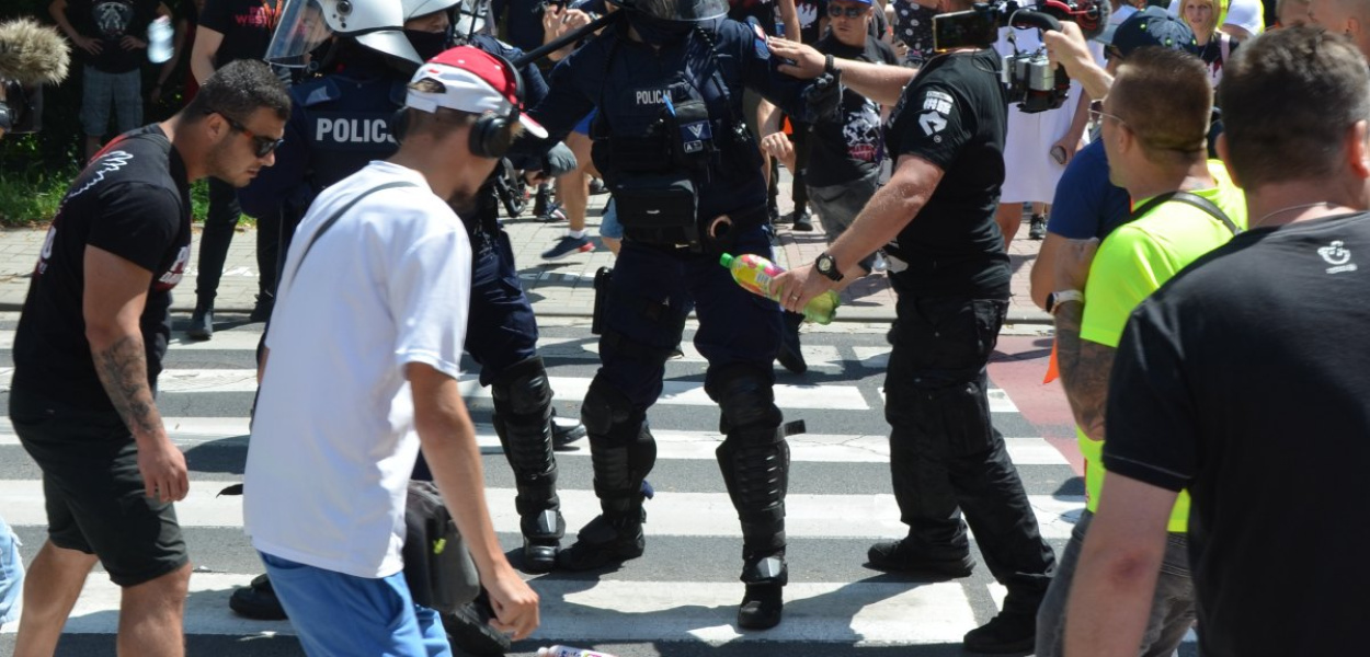 Zaczęły się przepychanki z policjantami. Funkcjonariusze się wycofali. Wsiedli do radiowozu i po chwili z niego wyszli, ale już ubrani w kaski i z dłońmi na pałkach policyjnych. Tłum zaczął krzyczeć. Wielu ludzi podeszło bardzo blisko do policjantów przy radiowozie. Doszło do szarpaniny. Policjanci ciągnęli do radiowozu jednego z uczestników, protestujący próbowali go policjantom odebrać. Nie udało się. Kilka osób dostało pałką policyjną, ale i policjanci także otrzymali kilka ciosów.