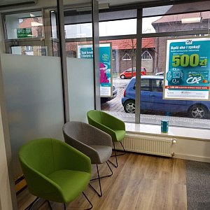 Kluczowym elementem wystroju są wygodne kanapy przy stanowiskach obsługi, których wysokie oparcia tłumią rozmowy klienta z doradcą i nie pozwalają nikomu zaglądać przez ramię. Są też zamykane, szklane boksy do dłuższych rozmów i przestronna poczekalnia z siedziskami dla klientów, w której mogą podładować telefon komórkowy. Wszystkie meble i elementy wykończenia wnętrza wykonane zostały z materiałów przyjaznych środowisku. Wystrój dopełnia dyskretne oświetlenie i delikatna muzyka tląca się z głośników.