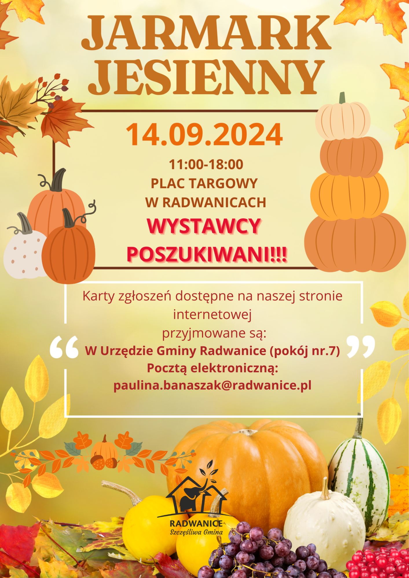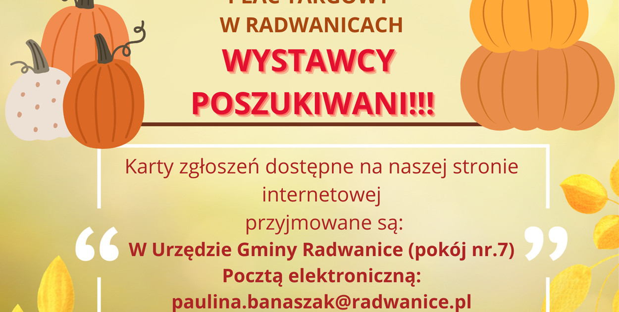 Karty zgłoszeń: https://www.radwanice.pl/Aktualnosci/Wydarzenia/WYSTAWCY-POSZUKIWANI~n1281
