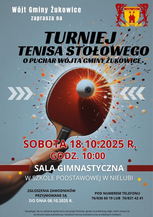 Do 8 października mieszkańcy mogą zgłosić udział w Turnieju Tenisa Stołowego o Puchar wójta gminy Żukowice. Areną zmagań będzie sala gimnastyczna w Nielubi, a sportowe emocje rozpoczną się 18 października o godzinie 10:00.