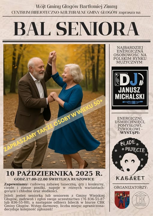 Wójt gminy Głogów oraz Centrum Biblioteczno-Kulturalne Gminy Głogów zapraszają na Bal Seniora 2025, który odbędzie się w piątek, 10 października, w godzinach 17:00–22:00 w świetlicy wiejskiej w Ruszowicach.