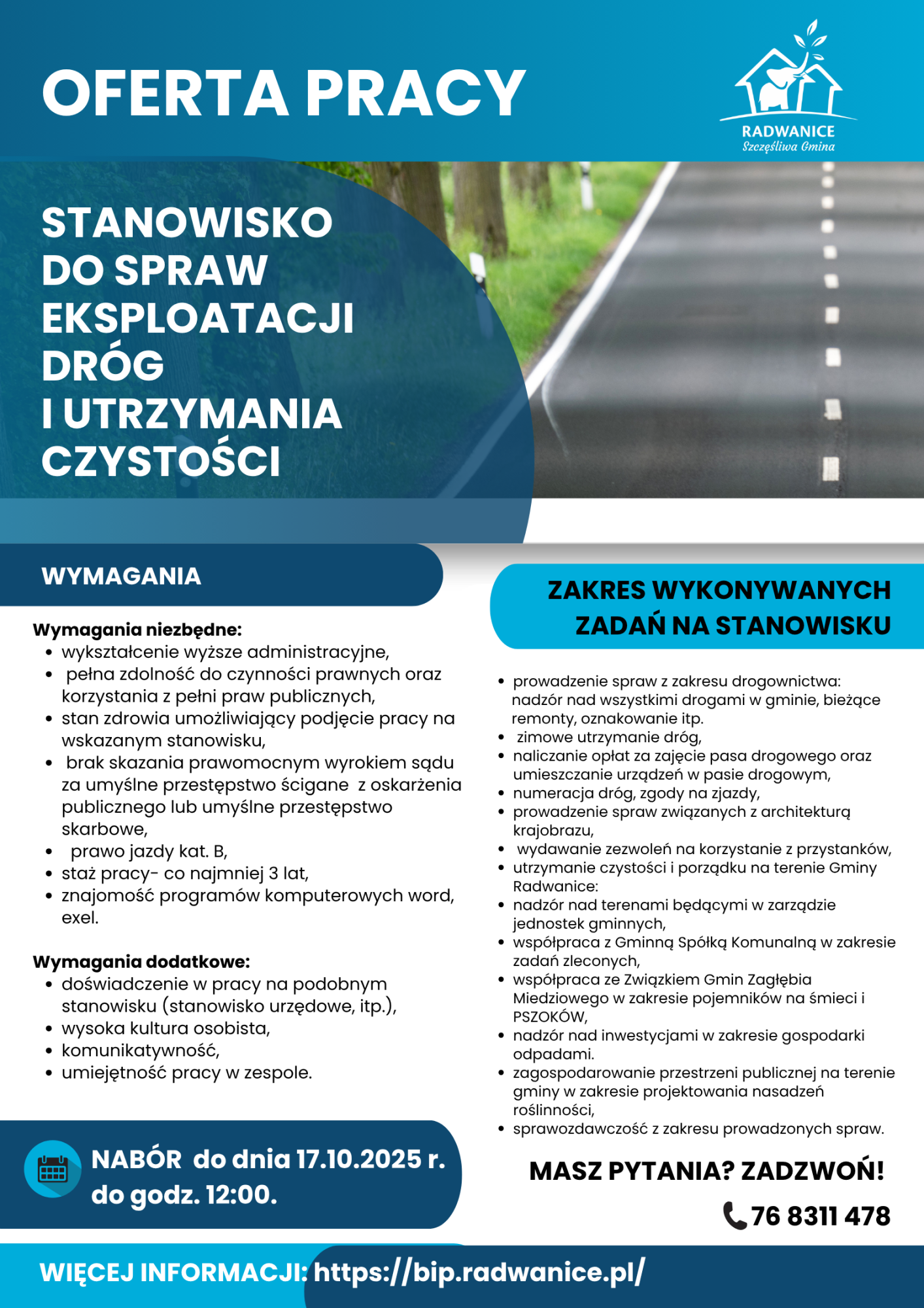 Druga oferta dotyczy stanowiska odpowiedzialnego za bieżące utrzymanie dróg gminnych, nadzór nad pracami porządkowymi oraz dbałość o estetykę przestrzeni publicznej na terenie gminy Radwanice.