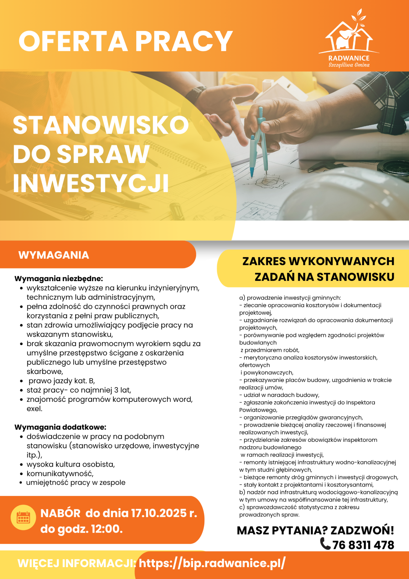 Osoba zatrudniona na tym stanowisku będzie odpowiedzialna za realizację i nadzór nad inwestycjami prowadzonymi przez gminę Radwanice. Do głównych zadań należeć będzie m.in. przygotowywanie dokumentacji inwestycyjnej, współpraca z wykonawcami, monitorowanie postępu prac oraz rozliczanie projektów.