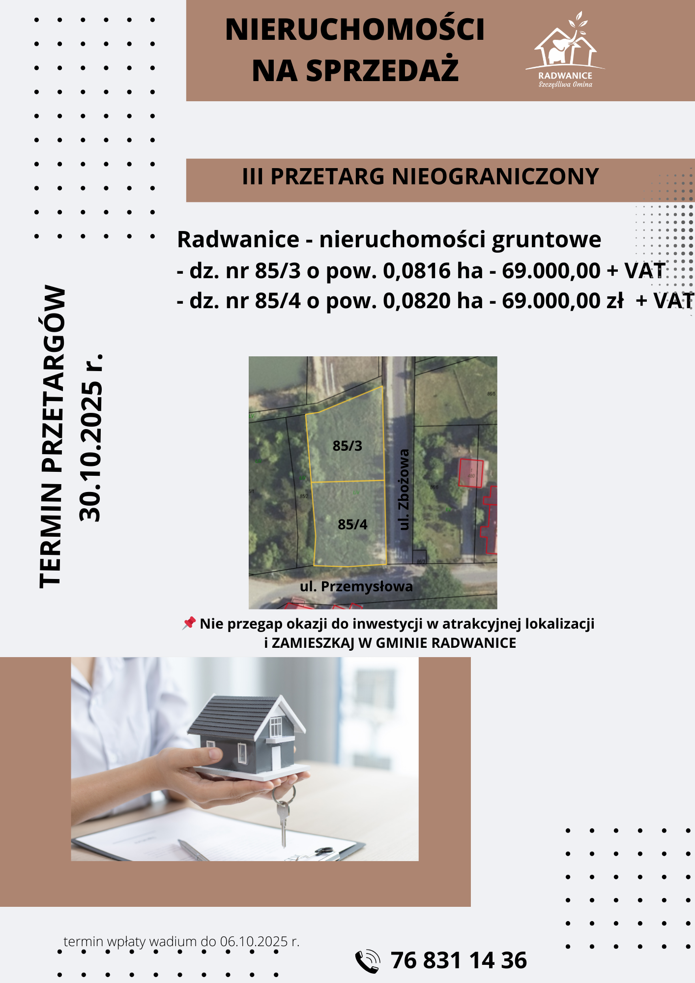 Kolejny, III przetarg, odbędzie się 30 października 2025 roku i obejmuje nieruchomości gruntowe położone w Radwanicach przy ulicy Przemysłowej i Zbożowej. Do sprzedaży przeznaczone są działki: nr 85/3 o powierzchni 0,0816 ha w cenie wywoławczej 69.000,00 zł + VAT oraz nr 85/4 o powierzchni 0,0820 ha w cenie wywoławczej 69.000,00 zł + VAT. Termin wpłaty wadium upływa 6 października 2025 r.