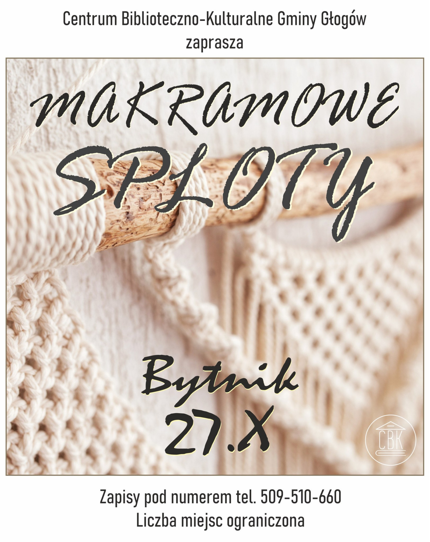 Centrum Biblioteczno-Kulturalne gminy Głogów serdecznie zaprasza na warsztaty rękodzielnicze „Makramowe Sploty”, podczas których uczestnicy będą mieli okazję doskonalić technikę makramy, wykonując ozdobne kwietniki.