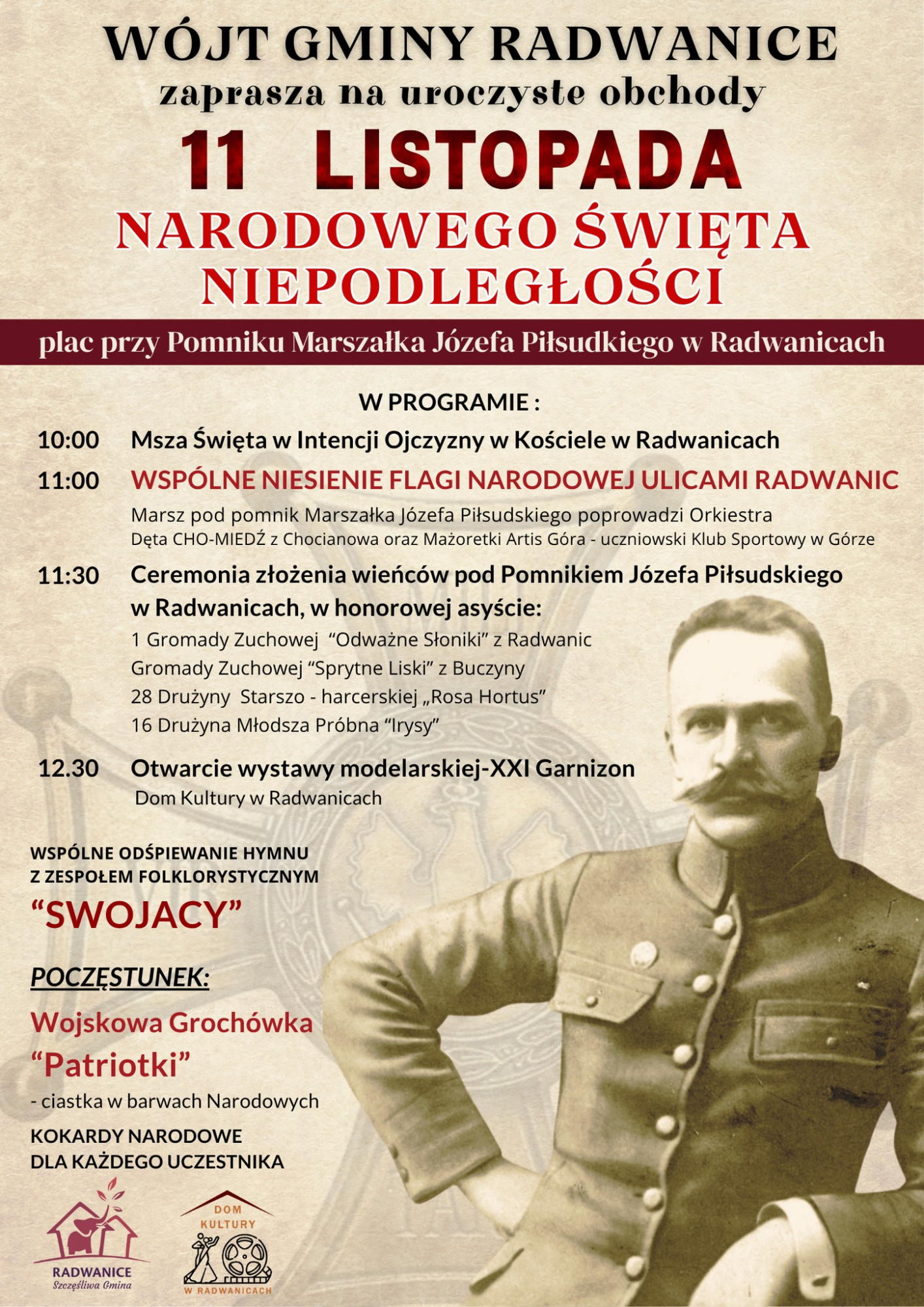 Wójt gminy Radwanice zaprasza mieszkańców do wspólnego świętowania Narodowego Święta Niepodległości. Uroczystości odbędą się w poniedziałek, 11 listopada, na placu przy Pomniku Marszałka Józefa Piłsudskiego w Radwanicach.